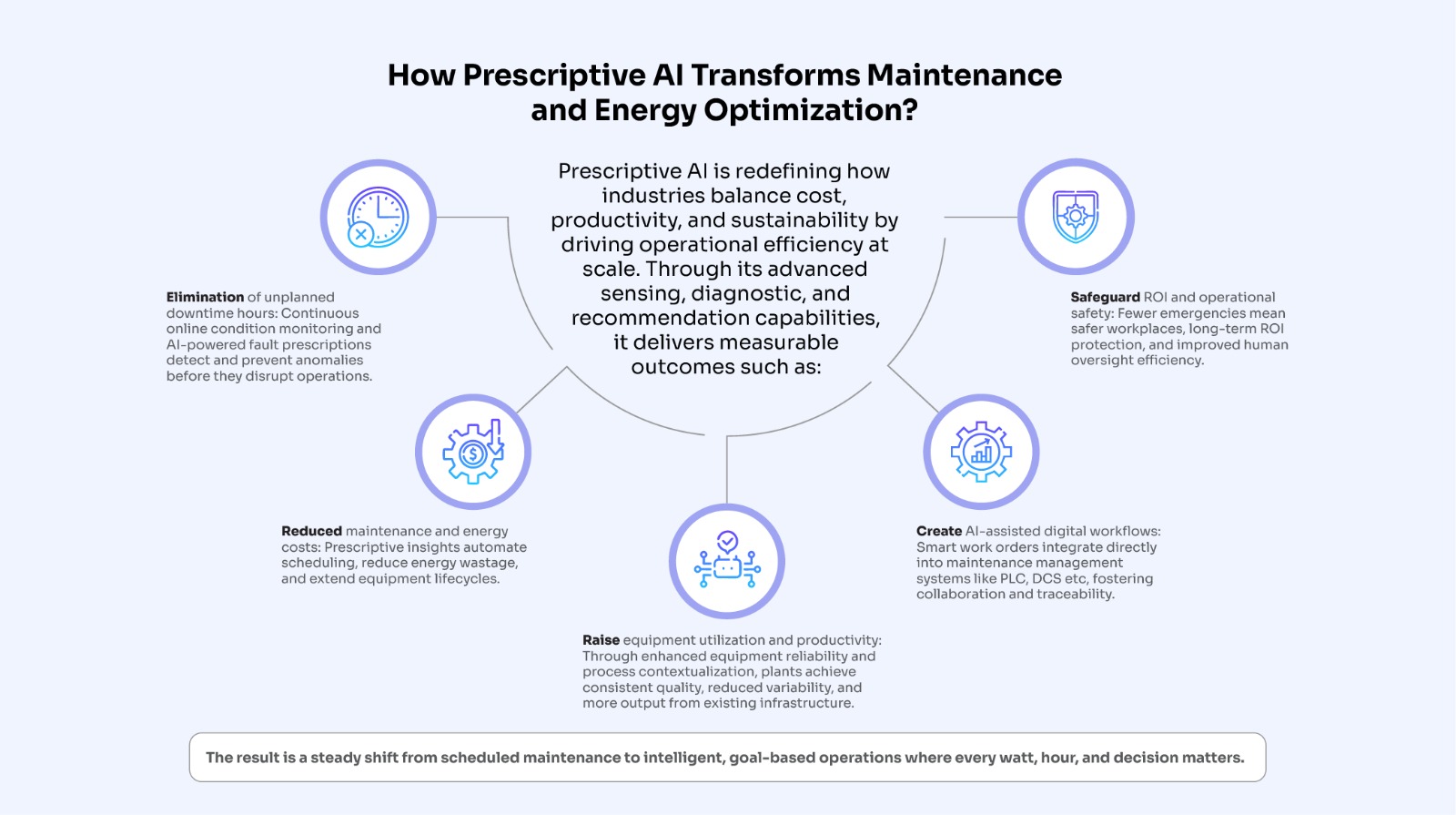 | Outcome | Minimizes unexpected breakdowns by improving foresight into potential failures. | Maximizes operational reliability and energy efficiency through AI-assisted actions that eliminate root causes, balance workloads, and optimize asset performance. |