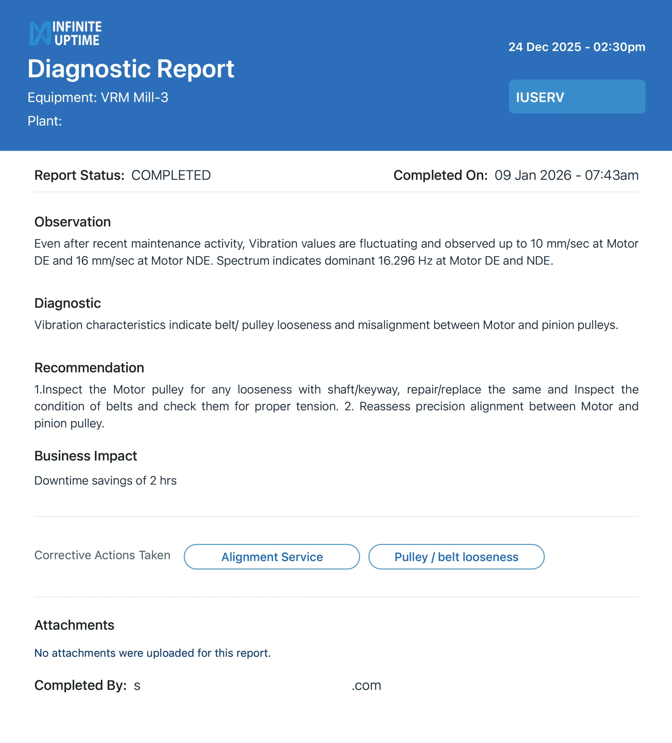 | 16.296 Hz Dominant Peak | Pulley/Belt Misalignment | Reassess precision alignment & check belt tension. |
