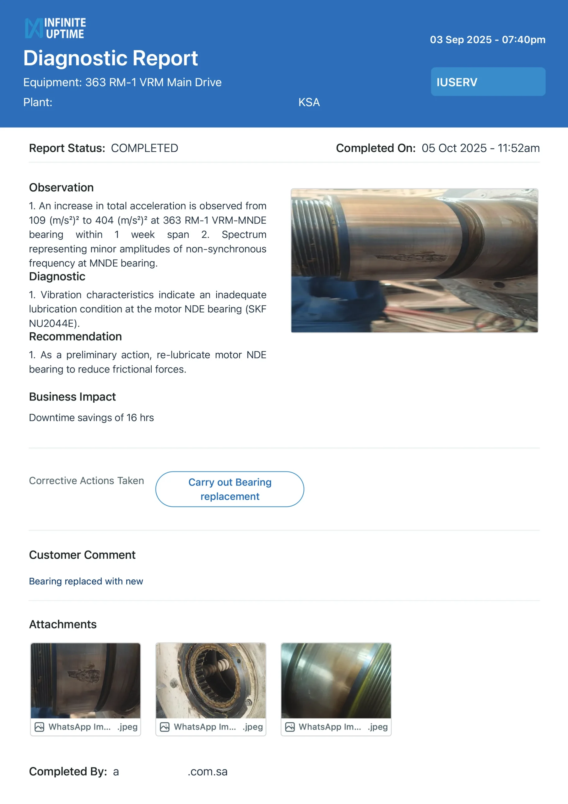 User Validation: “Following the PlantOS™ alert, our maintenance team inspected the drive-train during a planned stop. We confirmed significant gear wear between the pinion and gearbox that would have caused a catastrophic trip.”
