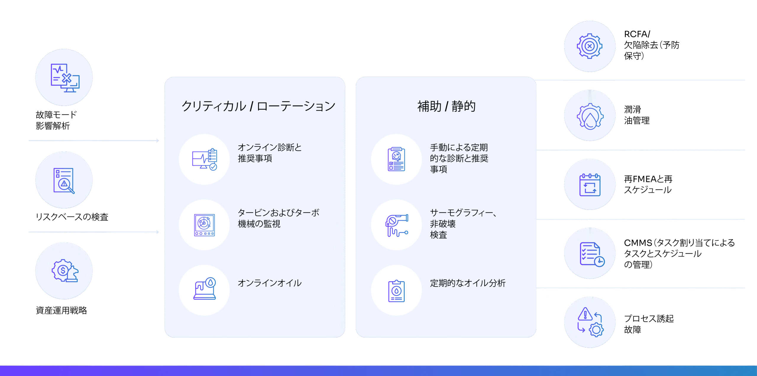 PlantOSTMは補助機器および静的機器をカバーし、包括的な信頼性を確保するための定期的な診断と推奨事項を提供します。