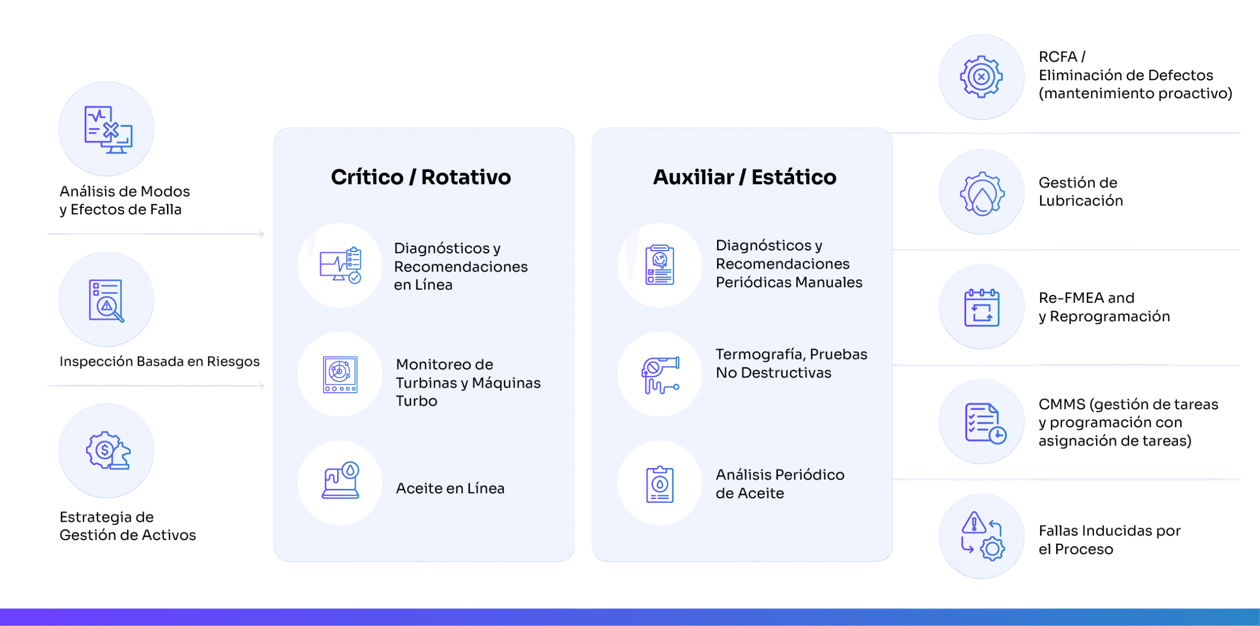 equipos rotativos críticos, sistemas auxiliares, activos estáticos y optimización de procesos.